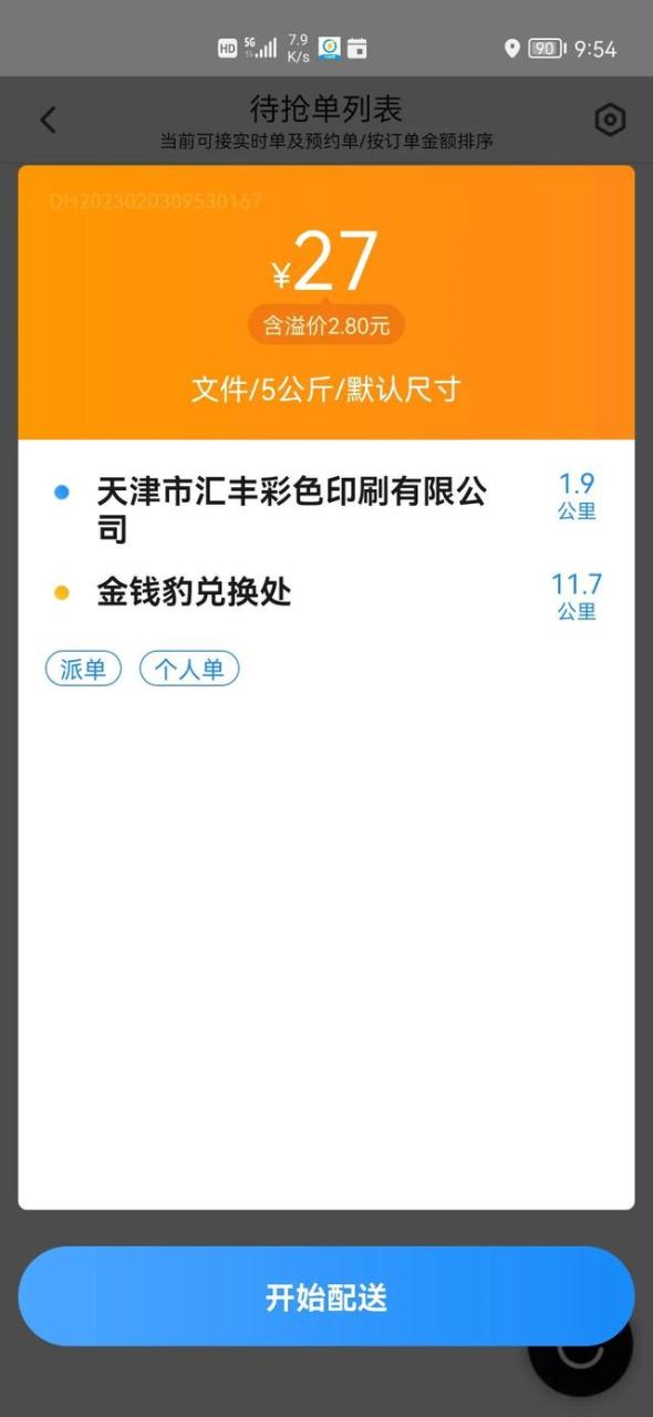 第二单,从津南出发想直接奔四信大厦的,结果半路来了一单从汇丰广告公司去金钱豹兑换处的,到地方才知道给部队送一块垫子,咱也不知道怎么用,咱也不敢问,这一单11.7公里,27元,用时13分钟就送到了。