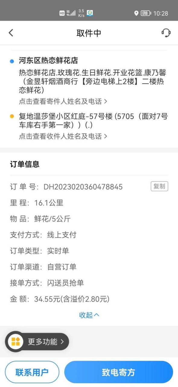 第三单,抢了一单河东热恋鲜花去复地温莎堡的的订单,目的地空港,此单34.55元。