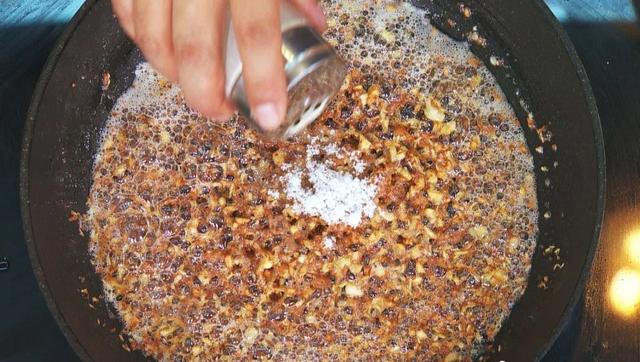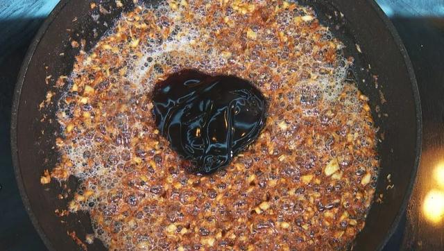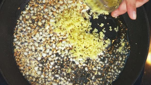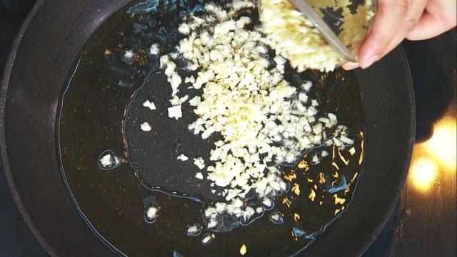 蒜末下锅煸炒至上色,加入等量的姜末煸香,再加入两倍量的海米碎,放少许盐、糖、胡椒粉、蚝油,小火煸炒至入味后盛出。