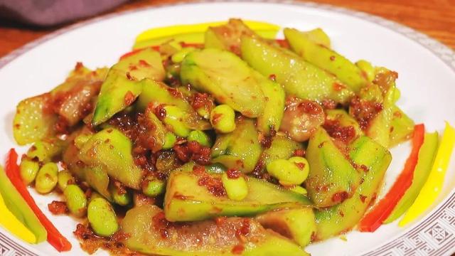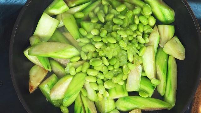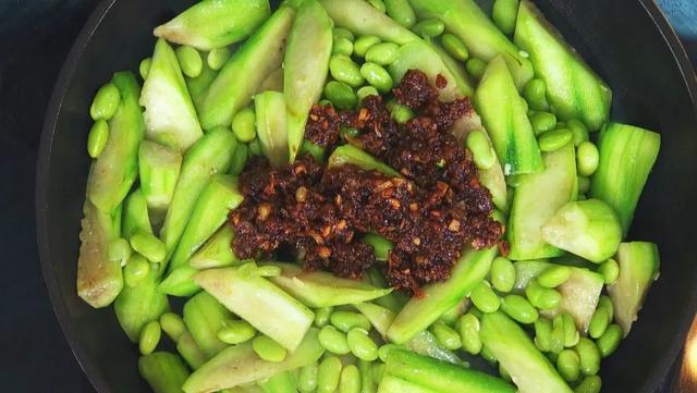 丝瓜切块后下锅,加少许水大火煸炒断生,倒入焯煮过的毛豆,放入海米酱,加少许水淀粉和香油,煸炒成熟即可。