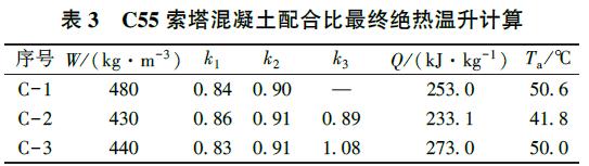 根据公式,计算Q0=334.7kJ/kg;k1,k2,k3在配合比C-1,C-2,C-3中的取值及配合比的计算最终绝热温升值Ta,如表3所示。