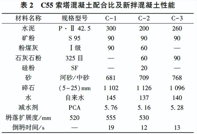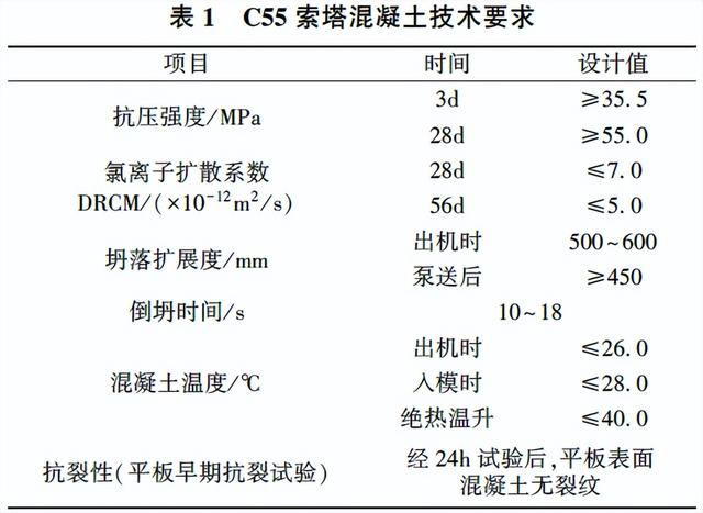 根据上表的技术要求来看,索塔混凝土应具有较高的早期强度和抗塑性收缩裂纹的能力,有低的绝热温升,温峰后,有较低的降温速率,并有较高的最终强度和抗氯离子渗透性能。在新拌混凝土方面,应具有优异的和易性和可泵性,经泵送后,具有良好流动性和可施工性。