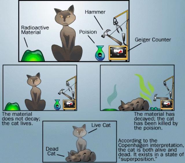 “薛定谔的猫”是一个简单的实验想象,它描述了一只猫被关在一个柜子里,同时还有一颗毒药,如果一个随机事件发生,毒药就会被打破,猫将会死亡。根据量子力学,在这种情况下,猫处于一个“混沌状态”,即同时处于生存和死亡两种状态,直到有人打开柜子并观察到猫的状态。