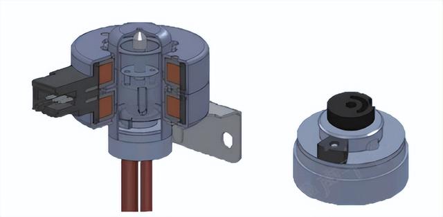 电动阀的基本工作原理是按照预设的程序控制步进电机运转,通过内部线圈驱动磁转子运动,磁转子再带动滑块转动。利用滑块上设计的月牙槽来对应打开各个阀口,从而实现进出口管路位置处的流量切换,通过线圈各爪级与磁转子的吸合力保持工作状态[5],其内部结构示意如图2所示。