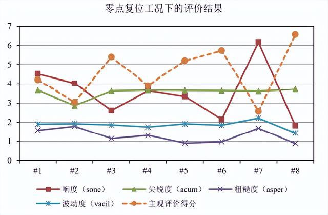 如果仅分析声压级这个评价指标,相比初始结构所有电动阀改善设计方案的声压级均有降低。其中,方案#1安装结构优化和#4安装材料替换这两种单一方式优化,声压级减小较少;方案#5、#6、#8多种组合方式的结构设计,其声压级均有明显改善,减小到40dB(A)左右。但是,进一步分析发现,例如#2对应的设计方案,虽然声压级指标有明显下降,但主观评价得分没有改善,这是因为其他心理声学指标并未同步降低,需要综合多个指标进行分析研究。