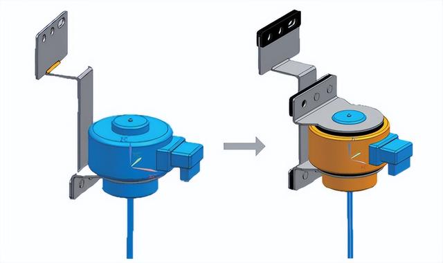 冰箱电动阀一般的结构设计及安装固定方式如图3所示。电动阀下部进出管路与制冷系统相连,控制各间室自动切换;电动阀阀体下部设计为不锈钢固定支架,然后其外伸折弯部分通过金属钉铆接于安装臂上;安装臂上部为一体式固定端,其上预留有小孔,最后通过螺钉安装固定到冰箱后背板上。