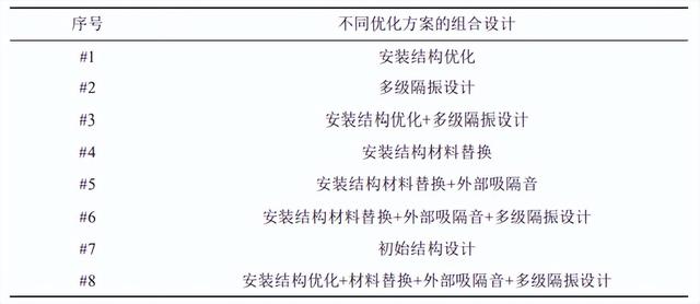 将以上多种设计方案进行优化组合,并依据实际安装应用情况进行匹配设计,得到如表1所示的8种改善方案。初始设计与其中一种优化设计方案的结构对比示意如图4所示,根据各种不同方案进行了安装结构的样件制作,开展噪声性能测试对比验证。