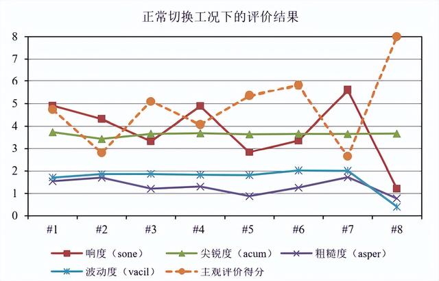 对比不同设计方案的主观评价得分发现,相比初始设计,各改善方案的得分均有所提高。其中,方案#8对应的多种优化方式组合设计,在电动阀正常切换工况下得分达到了8.000分,主观评价描述为“很好的声音体验”;在电动阀零点复位工况下的主观评价得分也达到了6.567分,对应描述为“可以接受的声音体验”。方案#8对应的客观参数指标中,声压级、响度、粗糙度数值也均为最低,主客观结果表明其为优选设计方案。方案#5和#6的主客观评价结果也相对较好,可以结合实际安装情况及成本作为备选方案。