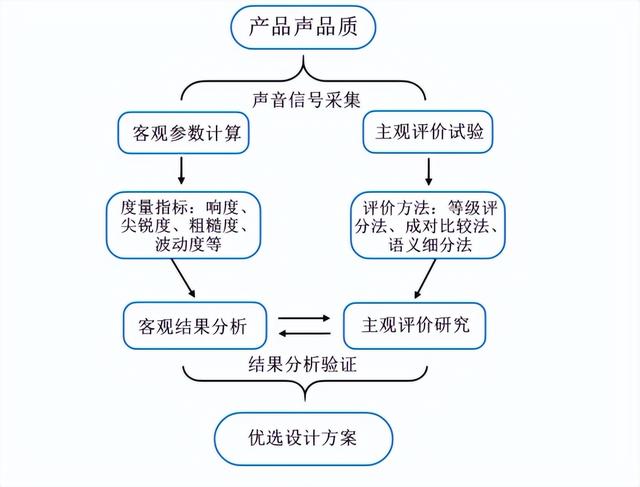 声品质评价技术,即通过一系列主客观声品质分析评价手段,综合多个客观参量与主观评价结果形成映射关系,用以代表产品声学特征的评价方法。针对特定型号产品和部件的声学特征,其能稳定、精确地定义所评估产品的某个声音表现,反映用户主观声音感受。声品质评价技术的研究流程如图5所示:主要包括声音信号采集、客观心理声学参数计算、主观声品质评价试验、主客观结果分析验证等几个关键步骤。