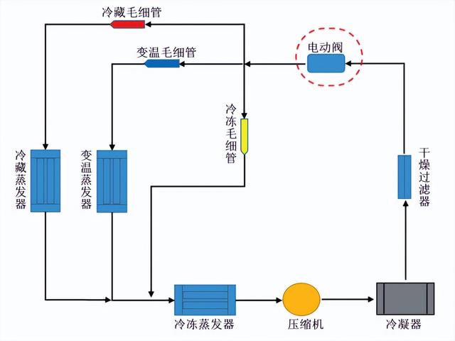 现有的大容积多功能冰箱系列繁多、控制模式多样。因为分类明确的各间室具有不同的制冷温度需求,所以普遍采用能够自动切换的多循环制冷系统[4],如图1所示。冰箱中冷藏、冷冻、变温等多个间室的系统切换和制冷剂流量控制,采用图1系统中的电动阀来进行动态调节实现。