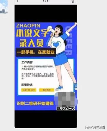 就是图中,所示,我一看这不是常见的诈骗套路吗?小说文字录入员,扫码后可下载,对应的APP,然后做任务。