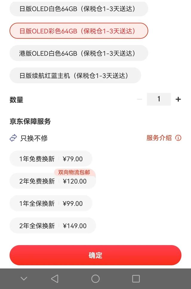 最后选择了日版switch OLED(别问我为什么不买国行,避免营销嫌疑烦请自行百度),一切正常的选择店家,为了保险起见还特地选了官方直营店,同时还加上了两年内质保免费换新的服务(结果又是一个坑)。付款选择型号,然后耐心的等待。