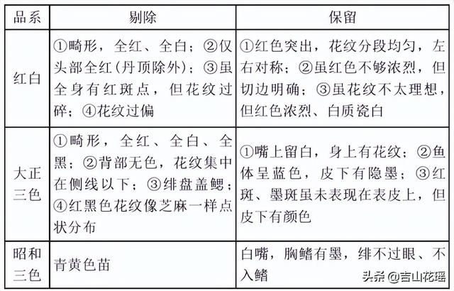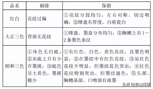 红白、大正三色、昭和三色锦鲤一选的挑选标准见表3。