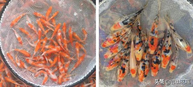 评价锦鲤的优劣,体形是排在第一位的。体长12~15厘米的锦鲤已经可以通过骨架看出未来的体形,所以三选的首要标准就是骨架大,在骨架大的基础上再对花纹进行优中选优。