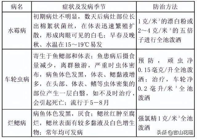 鱼苗下塘后,随着水温的升高和鱼体的长大,经常根据水质和水色状况加注新水,每次注水深度为 10~20 厘米,逐步将水位加至 1.2~1.5米。池水溶氧保持在4毫克/升以上,水色以黄绿色或草绿色为宜。培育期间,每隔15~20天使用消毒剂或杀虫剂等全池泼洒,以预防鱼病的发生。鱼种培育期间常见疾病及使用药物情况见表2。