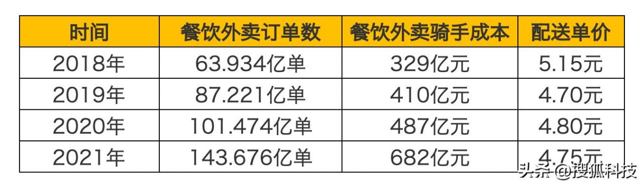 2022年美团年度财报显示,其配送成本为802亿元,配送笔数为176.702亿单,约合单价为4.54元,较2021年的单价4.75元进一步下降。