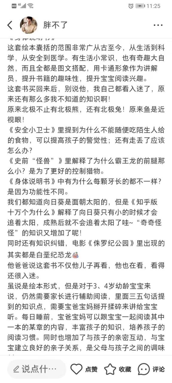 在这篇书评里,我就写出了这本《知乎版十万个为什么》有纠错的功能,《侏罗纪公园》里出现的恐龙,其实并不生活在侏罗纪,而是生活在白垩纪。这个是不是颠覆了你对这部电影的认识,奇奇怪怪的知识又增加了,是不是就提起读者的阅读兴趣了?同时还可以增加跟孩子的互动,可以一起探讨,是不是就吸引了年轻爸妈前来购买了?