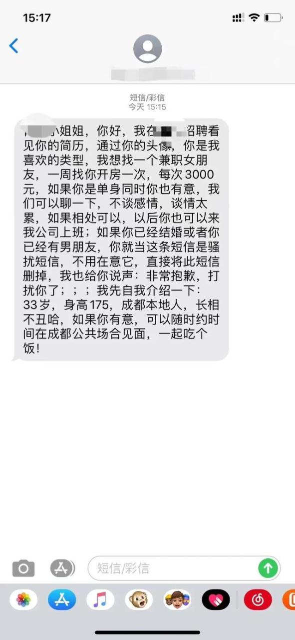 这个app虽然不是交友软件,但是它却被不少的人使用,不是找工作,企业招人,而是别有用心,在上面做着一些“灰色交易”。但是相对前面的社交app要收敛的很多,没有挑逗话语,没有软色情,没有大尺度的聊天,但是根据网友举报,依旧存在不合法的行为,下面给大家看一张截图。