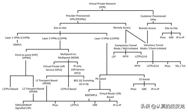 VPN 的类型很多,使用的技术也各不相同,因此 VPN 对应的 OSI 层次很宽(“1层”到“6层”)。我到XX百科剽窃了如下这张图,让你见识一下 VPN 的多样性。