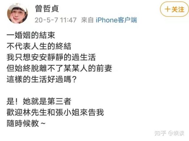 更公开指责张庭:“是!她就是第三者。欢迎林先生和张小姐来告我。”