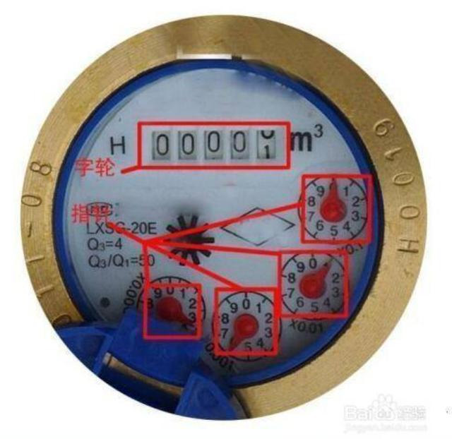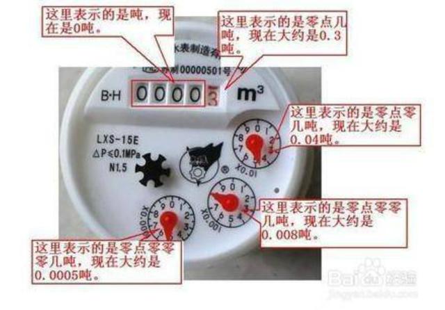 我们家里常用的机械水表也称旋翼水表,是通过水流推动内部的齿轮来达到计数的,表盘上方是数字轮,用来表示我们用水量的,抄表员看的也就是这一排数字。下方有四个指针,最左边是千分位,对应的是小数点后四位,由左往右以此类推,千分位转一圈百分位数字向前进一,百分位也是一样,当最右边这个指针转一圈的时候,上面的数字键就会加一,这样就代表我们用了一顿的水,表盘上显示的数字是多少,就代表你们家从开始到现在所有的用水量,如果想要知道这个月你们家用了多少水,就拿现在的读数减去上个月底表盘显示的读数,所得的结果就是你们家这个月所使用的用水量了。