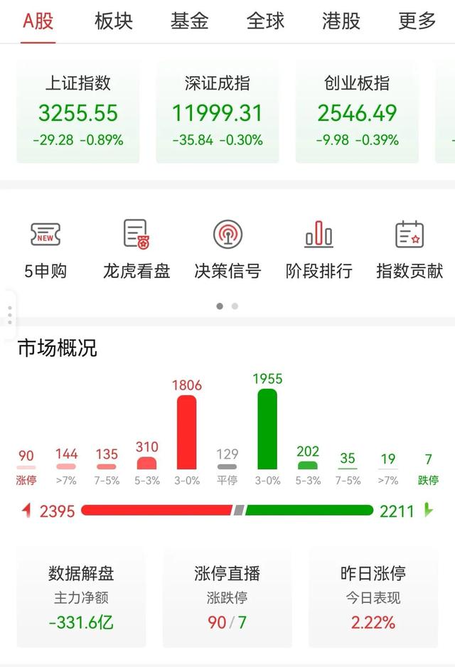 2395家翻红(涨停90家,昨天106家),2211家都是绿的(跌停7家,昨天5家)。虽然指数不咋的,但是红的家数还挺多。