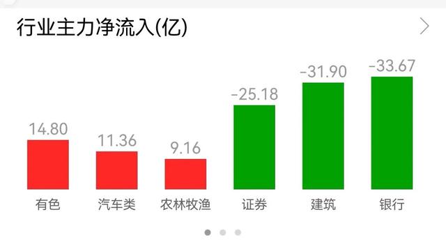 今天流入最多的是有色板块流入14.80亿(昨天流入45.40亿,连续两天大幅流入);其次是汽车类板块,流入11.36亿(昨天流入61.85亿,连续两天大幅流入);最后是农林牧渔板块,流入9.16亿(昨天流出4.94亿)。流出最多的是银行板块,流出33.67亿;其次是建筑板块,流出31.90亿(昨天流出13.70亿,连续两天大幅流出);最后是证券板块,流出25.18亿。
