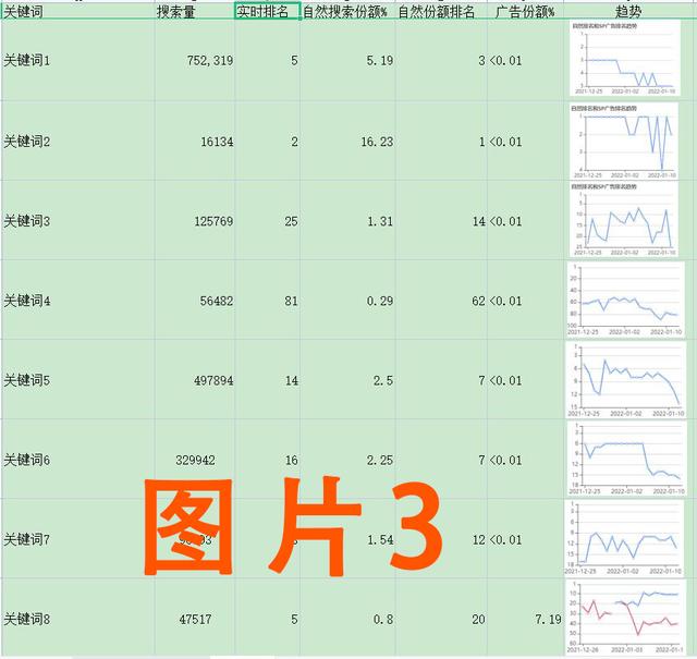 3. 趋势图。可以看到产品某个关键词的自然排名。固定时间查看每个关键词下,竞品和自己的产品的排名趋势,如果某个词竞品在上涨,而自己在下跌,那就一定要重点盯防,并做好相应调整,直到不再下跌。