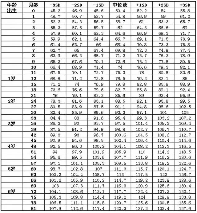 解释一下,这里的±sd是统计学的概念,比如-2sd就是距离中位数(50百分位数)两个标准差的位置,约为15百分位数的位置。而中位数不完全等于平均数,但是却代表一个人群中大多数人的身高,统计学里总会有身高矮的和身高高的,这才是统计的意义。在这个表里低于-3sd和高于3sd都是需要评估的情况,在家族身高正常的情况下,过高或过低都建议咨询医生。