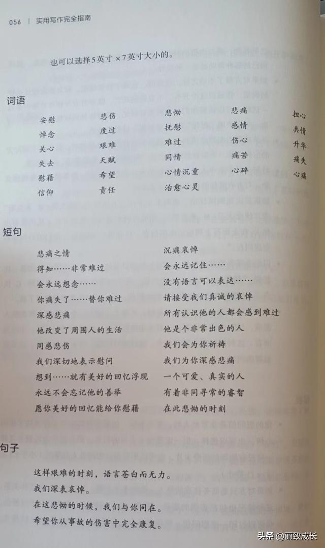 慰问卡的使用范围、内容要求、注意事项等内容在《实用写作完全指南》一书中都有详细的说明。作者还贴心地列出常用的慰问词语、短句、句子和段落以及写作模板和范例。