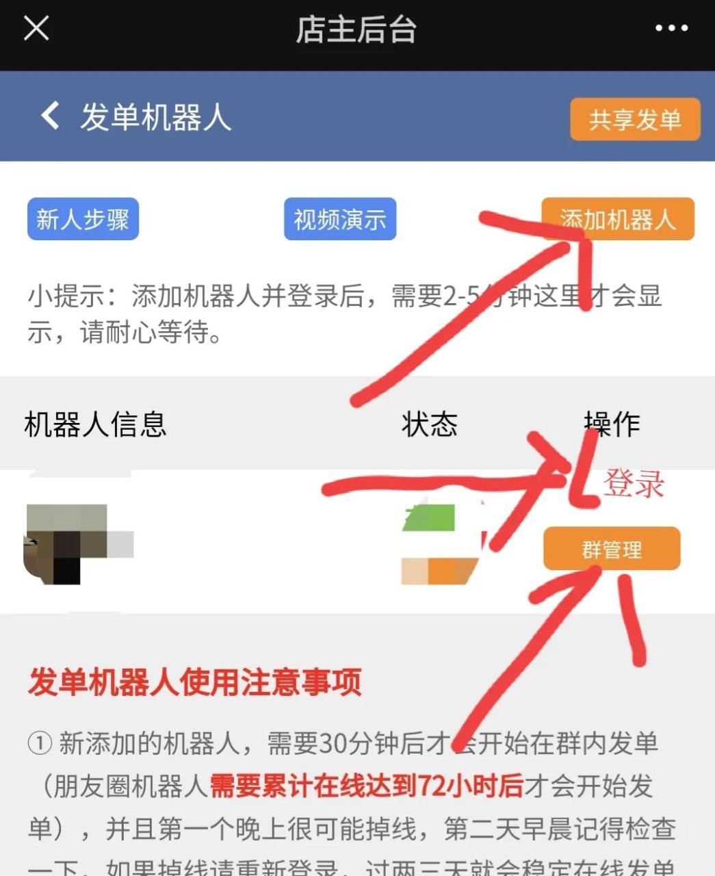 微信扫码后,关注公众号然后在右下角点击店主后台,手机号登入,然后点击发单机器人,添加机器人,然后下面会多出来一个信息,然后点击登录,接下来用自己要挂机的微信登录就行了。