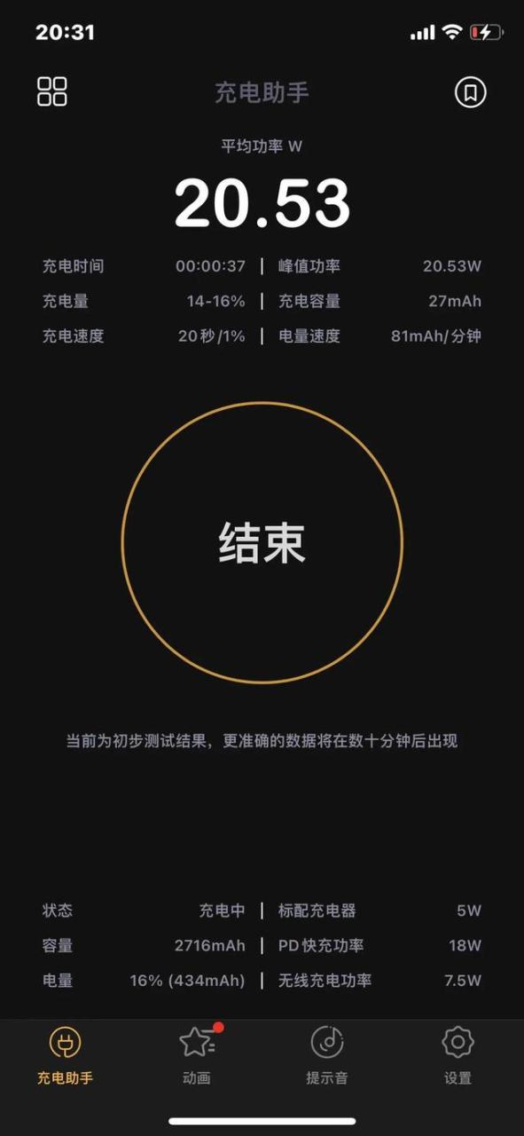 可以看到我用的iPhoneX是可以达到20w充电的,(测试软件名:充电助手,安卓手机可以用amperp)