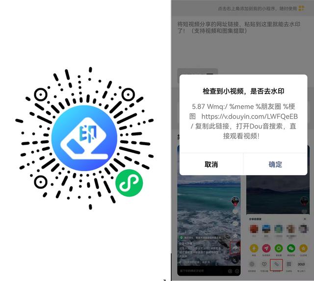 2、打开小程序【便捷短视频去水印】,小程序会自动弹窗获取你复制的视频链接。