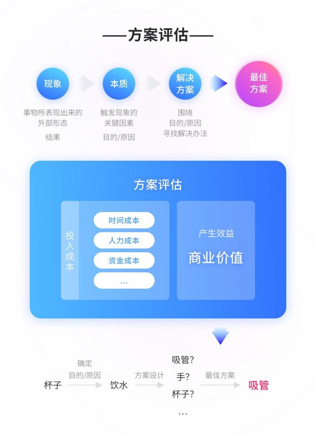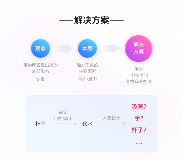 在“我想要一个杯子”的案例中,基于用户目标的不同,我们的解决方案不尽相同,可以是茶壶、水塘,可以是吸管、勺子……