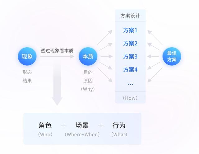 经过对特定的角色、场景、行为进行分析后,了解到事情的本质,有了目标,有了动机,我们再进行具体的方案设计。