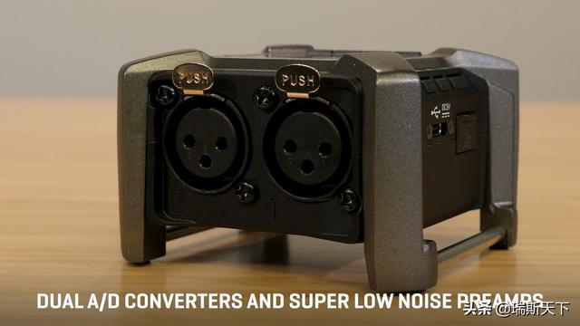 机身侧边自带了两个XLR接口,并且自带锁定不容易脱落损坏接口。内置的前置放大器能够实现-127dB超低底噪,提升音量之后抑噪能力还很不错。而它并没有搭载48V幻象电源,而是改为自动增益,通过算法就直接解决了麦克风供电问题,提升了续航,也确保了录音的稳定性。