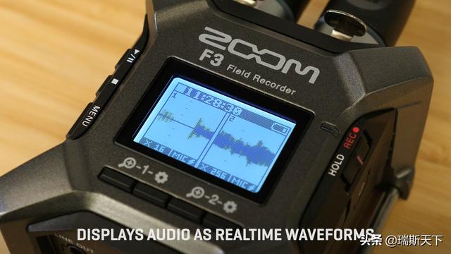 尽管它真的很袖珍,但功能并没有妥协。首先正面搭配了一块显示屏,包含了电量、录制时间、麦克风类型以及音频格式。配备的按键也很清晰,走带控制、音量控制、菜单,各种操作都很直观。在查看音频波形的时候,屏幕下方还有放大镜功能,实时输入的信号 一些小的杂音,放大波形就能看清楚了。