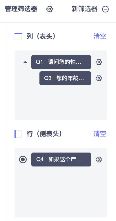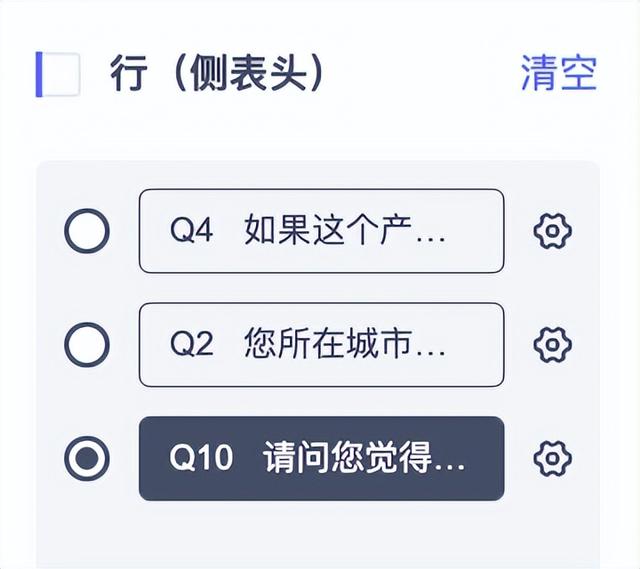 在行(侧表头)中可以拖拽多个问题,在表头——也就是自变量不变的情况下,自如地切换不同行的表格。