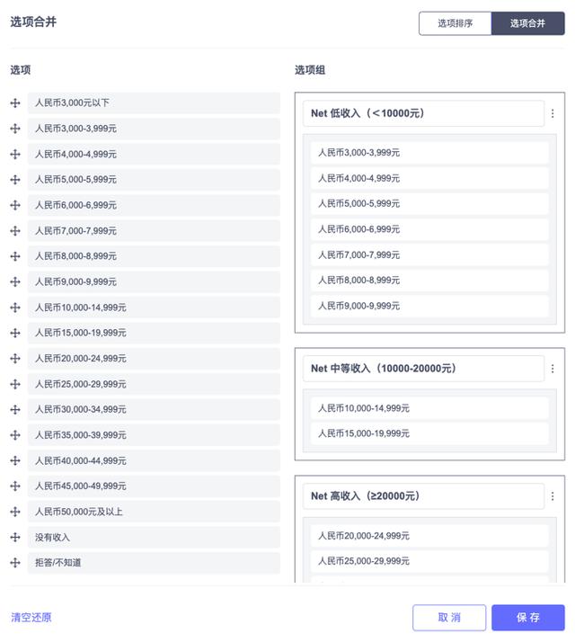 另一种方法是合并选项。比如对于年龄段、家庭收入等常见的人口属性调查问题,问卷设计时通常会将区间划分得比较细,而在实际回收问卷过程中,有的选项被选中的次数不多,对结果的影响不大,可合并为一个NET。例如在专业的市场调研问卷中,常将收入以500元为区间进行划分,如此一来选项多达20余个,而在交叉报表中可将根据一定标准合并为低收入、中等收入和高收入群体。