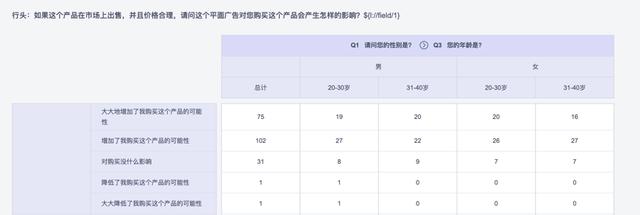 比如,在设计问卷前,你根据已有经验做出假设:某产品的购买意向和性别、年龄有一定关联。因此你设计了两个对应人口属性问题,在分析数据时就可以使用交叉报表印证假设。