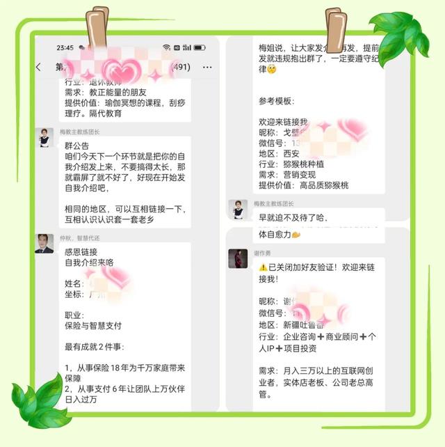写完了,主持人就组织大家把自我介绍发群里,主持人、运营团队的老师、小伙伴带头发自我介绍进群里,有人带动了,其他的社群成员也就咔咔的往群里发介绍,那场面叫一个火爆,往上一翻,这个很优秀,那个是老乡,这个的资源我想链接……想涨粉的如愿涨粉了,想找资源的找到方法,想找合作的也找到了。