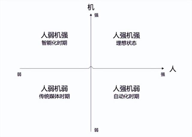 这种情况的出现可能与机器在数字广告业中的地位越来越高、而人的位置逐渐边缘有关。按照「人机关系」的分析框架,你会发现广告业的发展经历了「人弱机弱」「人强机弱」和「人弱机强」三个阶段。