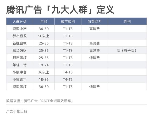 比如以往我们在数据洞察时,往往只重视性别、年龄等少数几个人口统计学维度;然而,即便同样是年轻人,群体之间的消费习惯也千差万别。比如腾讯的同学就提到他们推出了「九大人群」,25-35岁的年轻人可以归属到新锐白领、精致妈妈、都市蓝领、小镇青年这几个截然不同的群体中。如果企业只看面上整体的情况,很可能会将广告投放引向歧途。