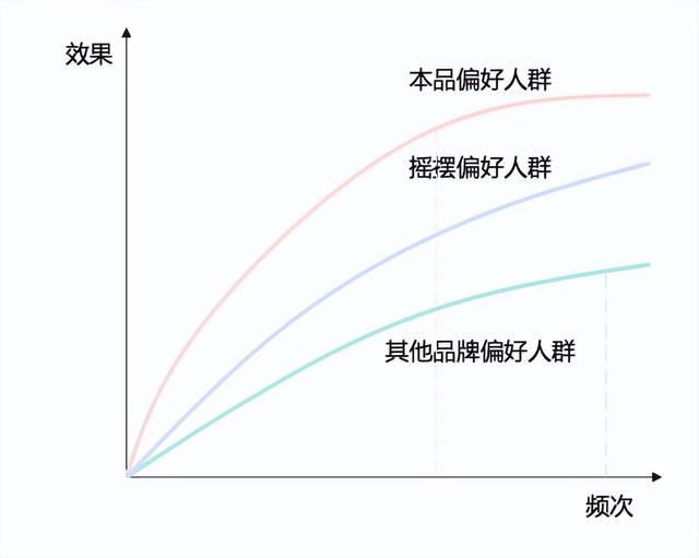 腾讯广告向我分享的一组数据,也恰到好处地佐证了这一判断:他们进行了一个有趣的实验,将用户原本的品牌偏好作为变量分组统计,分析了广告触达频次和实际效果间存在的关系,你会发现三组变量最终呈现结果存在极大差异。在下面这张图片中,可以发现如果消费者本来对某品牌存在偏好,广告主就不用过度投放了:节省不必要的投放开支倒是小事,关键是投放过多会引发用户的「逆反心理」。