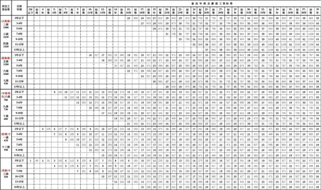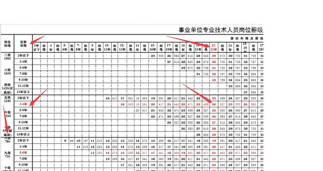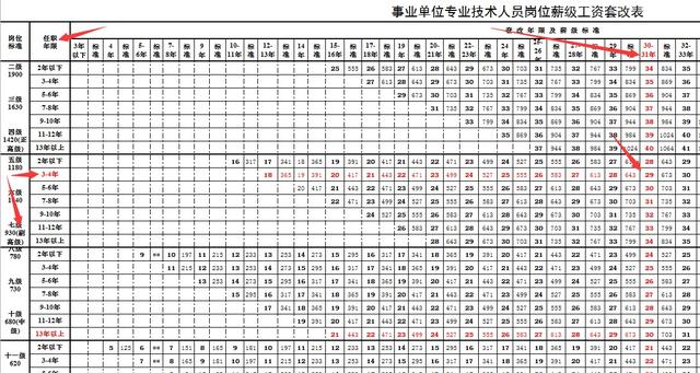 在表的上部任职年限一行找到31,即表中的“30-31年”,然后向下看。在表的左边找到“副高级”中的“3-4年”一行向右看,在刚才“30-31年”的交汇处是29,即于老师现岗位高职称套出来的薪级是29级。