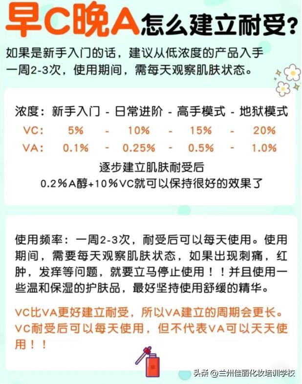 使用频率,新手一周2-3次,耐受后可每天使用;使用期间,需要每天观察肌肤状态,如出现红肿、刺痛、发痒的情况,就要立马停止使用,并用一些温和保湿的护肤品,也需坚持使用舒缓精华。VC比VA好建立耐受,所以VA建立周期会更长,VC耐受后可每天使用,但切记VA不可天天使用。
