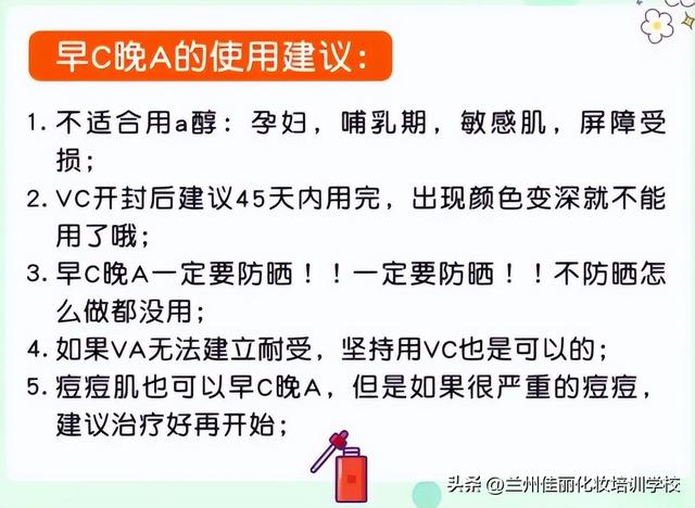 不适合用A醇:孕妇哺乳期、敏感肌;VC开封后建议45天内用完,如出现颜色变深就不能使用;早C晚A一定要防晒,不防晒怎么做都没用!如果VA无法建立耐受,坚持用VC也是可以的。