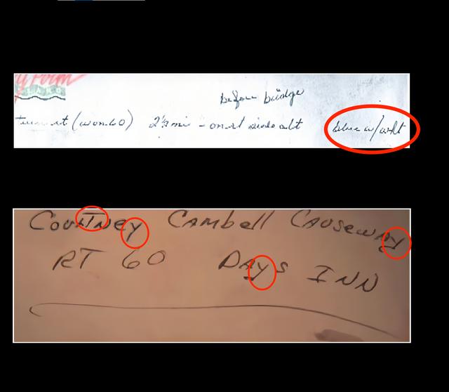 在车内的一个角落里发现了一个本子,他们发现本子上也写有相应的地点和酒店名字,警方将这连个笔记进行对比,发现不是同一个人写的。