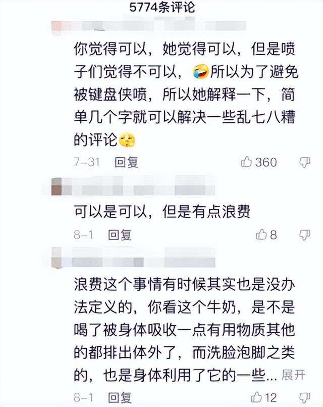 近日,“眉姐姐”斓曦曾在短视频平台上传了自己用过期牛奶泡脚的视频,在评论区就出现了“过期牛奶泡脚浪费吗”的争议,“可以是可以,但是有点浪费”和“浪费这件事你没法定义”成了两个帮派,你来我往,互不相让,在评论区掀起了一阵不小的风波。