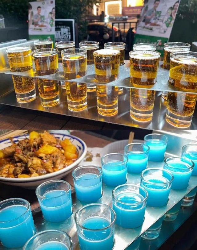 贰麻”意指微醺,成都爆火,连洛阳都比郑州开得早。贰麻的酒,论簸箩上,点开大图仔细瞧,那一瓯一瓯全是各种口味的小酒,彩虹小酒、鹤顶红、晕茶…花样百出,喝的时候可以用筒签摇起来,全是各种劝酒小妙招。